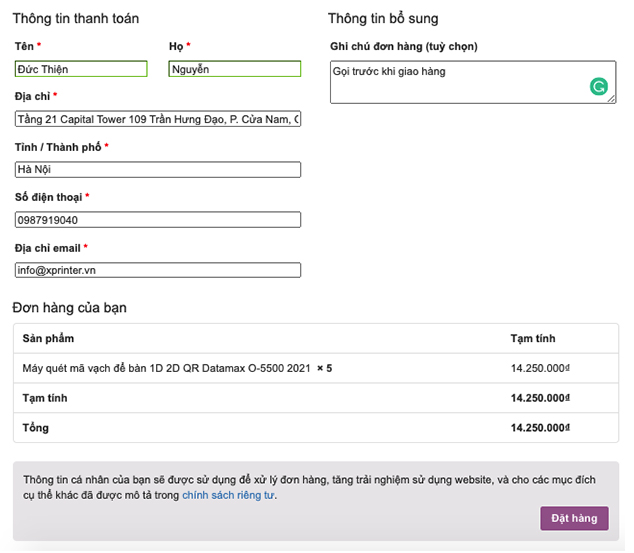 Điền thông tin đặt hàng: