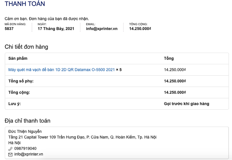 1. Đặt hàng qua email: info@xprinter.vn